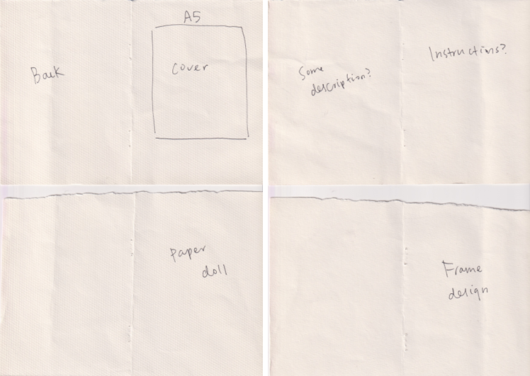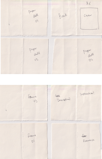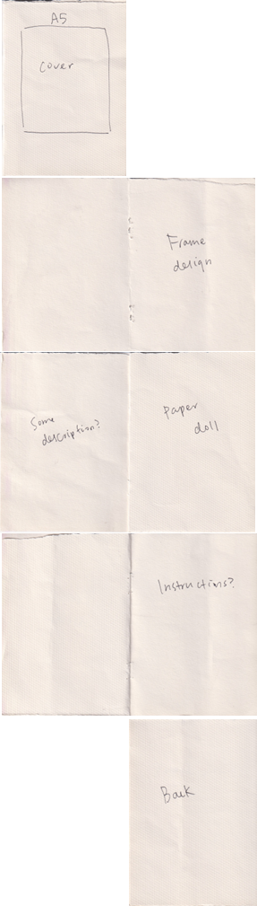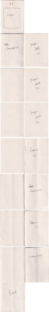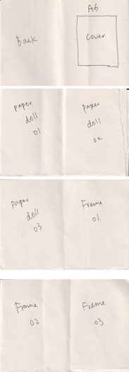 I realised to fit every paper doll designs including 3 other frame designs with total A3 size of format, A6 size of each pages which is too small for a paper doll. So I needed to make selections if I want to make a bigger page size.
